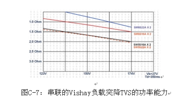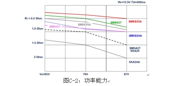 圖C-6是兩個串聯(lián)TVS的典型應(yīng)用,圖C-7是各種線路電阻和電壓條件下兩個串聯(lián)的負(fù)載突降TVS的功率能力。