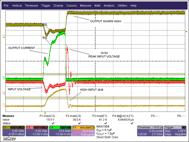 圖3.從波形可以看出,若輸入電容只有0.1µF,輸入電壓會(huì)上沖到一個(gè)潛在的破壞性高壓。