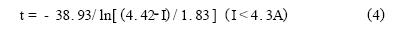 由表1可知,RXE系列PolySwitch元件所能承受的最大電流為40A。該點(diǎn)與臨界點(diǎn)之間為曲線的直線部分。設(shè)動(dòng)作時(shí)間為t(秒),故障電流為I(安),考慮到橫軸、縱軸均為對(duì)數(shù)坐標(biāo),兩者之間應(yīng)具有如下數(shù)學(xué)關(guān)系: