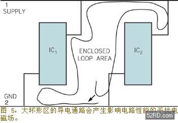 你如果使用布局和布線都很好的電路板,就可以顯著減少ESD問題的發生率(見附文《實現ESD故障最小化的電路設計原則》)。每一電路都因為有不同類型的元器件和電流而存在有靜電通量線和磁通量線。如果電路板布線圍住很大的環形區,則導電通路就會圍住較大的磁通量,由于環路起天線的作用,較大的磁通量又會在環路中感應產生電流。這種環路電流會產生影響電路中元器件的干擾電磁場。減小環路區的方法是使電源線和地線盡量靠近在一起。圖5示出了典型的電源線和地線形成的環路區。