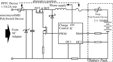 圖1是一個典型的電池充電電路。其中,交流電通過AC/DC電源適配器轉(zhuǎn)變?yōu)楹线m電壓對電池組進行充電。PPTC元件與過壓保護元件協(xié)調(diào)作用共同完成下列工作: