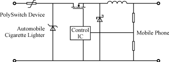 圖3顯示一個典型的CLA電路圖。圖3中是一個PolySwich自復(fù)元件和一個瞬時限壓(TVS)二極管提供輸入保護。IC用于控制DC/DC降壓轉(zhuǎn)換器,由PPTC獨用或與TVS相結(jié)合的保護措施可以防止以下4種故障造成的損壞。