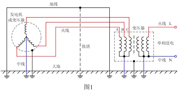 在圖1中,紅線A、B、C表示高壓輸送線路,高壓輸送線路一般都用鐵塔空架支撐,用以對幾十萬伏的交流電進行遠距離傳送,這樣,其經常受雷擊是不可避免的;為了避免雷擊,一般都在高壓線路的上方平行架設一條地線,這條地線一般稱為避雷地線。所謂地線就是與大地相連的導線,當打雷的時候,雷電首先會打到避雷地線上,避雷地線可把雷電引入地球,避免高壓輸送線路被幾億伏,乃至十幾億伏的雷電把發電機或變壓器的線圈與外殼擊穿,以及把與線路連接的其它電器設備遭受瞬間高壓沖擊而損壞。因此,圖1中的避雷地線與一般電子線路中的地線完全是兩回事。