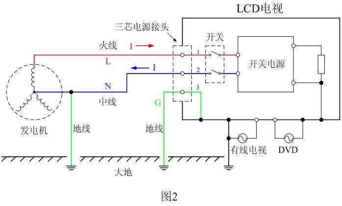 我們舉一個電視機為例,圖2是一個LCD平板電視機與電網正確連接時的工作原理圖。正常工作的時候,三相發電機(或三相變壓器)中的某一相220伏交流電壓通過火線(L)和中線(N)對LCD電視機進行供電。為了防雷,在發電機的一端,中線(N)一般都要與大地連接,由于火線(L)與中線(N)一般都是平行排列,當打雷時,雷電會同時打到火線和中線上,由于中線接地,它會把雷電的大部分能量吸收引入地球,僅有少部分能量最后轉成差模信號與輸送電壓混合在一起被傳送到用戶端。