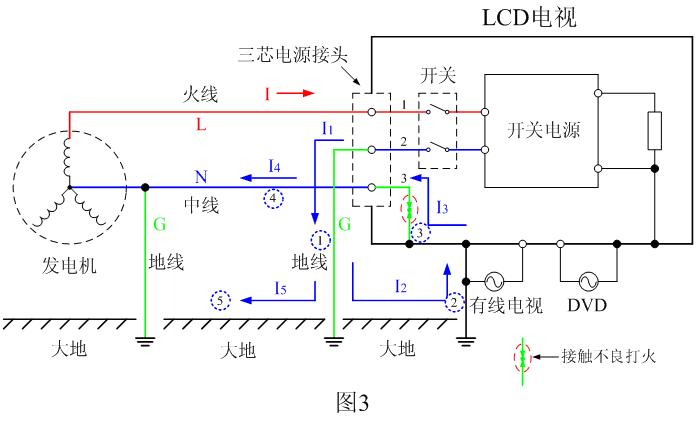但電流I1沒有按圖2中的正常路線直接經中線返回發電機,而是經地線(1)流入大地,然后電流I1在大地中被分成兩路I2和I5 ,I5直接通過大地(5)返回發電機;而I2則通過大地與電視機的其它地線(2)(比如有線電視信號線或與電視機連接的其它設備連線)流回到電視機的外殼一端,I2電流經過有線電視信號線接口(僅舉其中之一)后變為電流I3;I3再經電視機內的地線(3)以及電視機的三芯插頭3號線接頭,從三芯插頭3號線接頭流出,流出電流變成I4,電流I4再經中線(4)流回發電機。