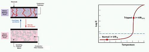 正溫度系數熱敏電(PPTC)保護元件採用半晶態聚合物和導電性顆粒制成。在正常溫度下,這些導電性顆粒形成位于聚合物中形成低阻值的電鏈路圖(圖2)。不管其熱量來自流經該元件的大電流還是環境溫度的上升,在溫度上升到超過器件的開關溫度(Tsw)時,聚合物內的晶體都會融化,形成非晶體物質。在晶體物質融化的過程中,其體積變大,造成導電性顆粒出現分離現象,并導致元件阻抗呈大幅度非線性增加。