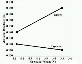 在USB的設計中,另一項重要的考慮因素是隨著電壓的下降,電阻值也會下降。隨著供電電壓的下降,電壓降問題顯得更加突出。一般來說,電壓下降將導致電源開關的導通電阻增加,這是一種不期望的特性。但Raychem的PowerSwitch元件的電阻卻能夠隨著供電電壓的下降而下降,因而避免這不利特性。如圖7所示,在匯流排電壓較高時,PowerSwitch能夠減少輸出電流值,提升電源的效率和電池的使用壽命。在匯流排電壓較低時,PowerSwitch兩端的電壓降也會降低,這樣USB功能就能繼續工作一段更長的時間。