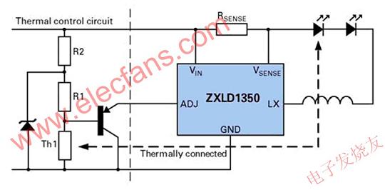 圖3顯示了一個典型的采用簡單熱控制的降壓穩壓器例子。它的優勢是利用了Zetex半導體公司ZXLD1350的ADJ引腳。通過使用一個PNP晶體管作為發射極跟隨器和使用該引腳的內部250kΩ電阻作為負載來過驅該引腳,LED電流將與熱敏電阻成比例地下降。隨著溫度下降,熱敏電阻的阻值增加,但由于基準(base)電壓增加超出了ADJ參考電壓,該晶體管就會關閉,LED僅獲得其最高設置電流,從而有效地鉗住低溫響應。