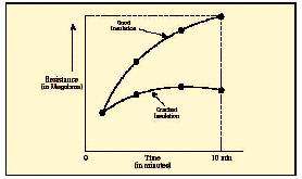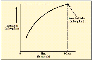 [page]在短時測試中,兆歐表被直接跨接在被測設(shè)備上,施加大約60秒的測試電壓。為了在大約一分鐘的時間內(nèi)使絕緣值讀數(shù)達(dá)到穩(wěn)定,應(yīng)該只對低容性的設(shè)備進(jìn)行該項測試。基本的連接步驟和驗證測試時相同,所施加的電壓按DC測試電壓公式進(jìn)行計算。當(dāng)測試好的設(shè)備時,您會注意到,隨電容容量和吸收電流的降低,絕緣阻抗值會穩(wěn)定上升。由于溫度和濕度會影響測試結(jié)果,應(yīng)該在標(biāo)準(zhǔn)溫度(大約20?C/68?F)下、露點之上的環(huán)境下進(jìn)行測試。 當(dāng)設(shè)備的額定值等于或小于1000伏特時,絕緣讀數(shù)應(yīng)該為1MΩ或更高。當(dāng)設(shè)備額定值高于1000伏特時,理想的阻抗應(yīng)該為每1000伏特上升1MΩ。所測量的絕緣阻抗值通常會略低于以前記錄的值,其下降的趨勢規(guī)律如圖6所示。絕緣值下降的斜率是絕緣材料老化程度的正常信號。陡峭的下降斜率是絕緣失效或可能出現(xiàn)故障的先兆。