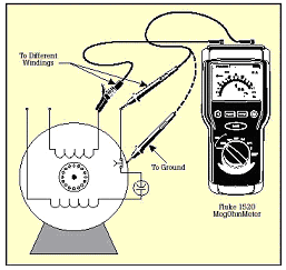 當(dāng)測試定子馬口鐵的阻抗時,要確保定子繞組和定子相是斷開的。測量繞組之間以及繞組和地之間的絕緣電阻。還有,當(dāng)測量DC發(fā)電機(jī)或馬達(dá)時,應(yīng)該將電刷提高,這樣,就能將馬口鐵和電樞分開來測量。下表列出了推薦的在不同的馬達(dá)額定電壓下的最小阻抗讀數(shù)