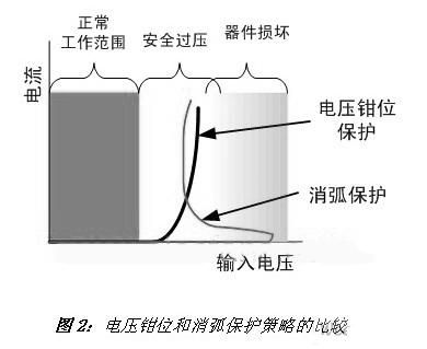 電壓箝位與消弧:電壓箝位器件的工作原理是從低電壓時的高阻抗轉換至高于導通電壓時的低阻抗,且沒有負阻抗區域(圖2)。這器件通過提供接地的低阻抗通道,對高于導通電壓的電壓進行箝位。消弧(crowbar)器件在低電壓時也呈高阻抗,但當電壓較高時觸發新的導通機制,使電流增大,并伴隨著電壓下降。因此,消弧器件擁有負阻抗區域。某些消弧器件的觸發電壓可能非常高。如果消弧TVS觸發器的速度足夠快,就可以經常提供保護,即便電壓已經達到可能導致器件損壞的電平。消弧器件有時也稱作“驟回”器件,因為電壓驟然下降。