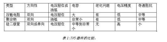 表1總結了前面談及的三類TVS器件的基本特性。選擇恰當的保護器件應考慮多種因素,其中關鍵的決定因素就是被保護電路的特性。
