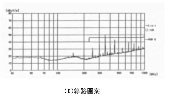 圖5是上述實驗所獲得的輻射資料。如圖所示7種線路圖案都有長70mm的直線部分,E與G的線路圖案的頻率為650~850MHz,直線部分長度為130 mm的;D與F的線路圖案有頻率為350~450MHz,具有較多的輻射。
