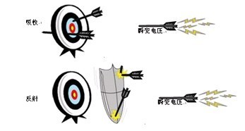 簡而言之,SPD 會阻止具有破壞性的瞬變電壓浪涌電平到達所保護的設備。SPD 通過吸收過剩的電壓、將其分流或者組合使用這兩種手段,達到削弱浪涌電壓的目的。圖 1顯示了飛向靶子的箭。靶子代表 SPD,而箭代表瞬變電壓尖峰脈沖。當箭擊中靶子時,它會被吸收并滯留在靶子中。然而,靶子的厚度將決定箭是否可以在沒有穿到另一側時停止。同樣,在這種模式下,箭將不停地損壞靶子,將來靶子可能無法很好地阻止箭。現在,假設在靶子前面有一個金屬盾牌。箭發出后,它會擊中盾牌,無任何損害地彈飛到靶子的旁邊。這就是大多數 SPD 的基本工作原理。SPD 吸收能量(并且根據它們的質地好壞,可以防止浪涌,但仍然會受到損壞),或者將電壓分流到設備接地線中。在大多數情況下,SPD 會將吸收和分流瞬變電壓浪涌的設備組合使用。