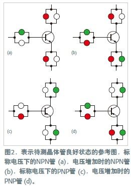 當一只正常晶體管插在測試端子之間時,它限制電流只能沿某些方向流動。串聯(lián)的LED表示出這些方向,因此指示出了晶體管的類型。例如,對NPN晶體管,LED發(fā)光為紅-綠-紅;而對PNP晶體管,發(fā)光為綠-紅-綠。
