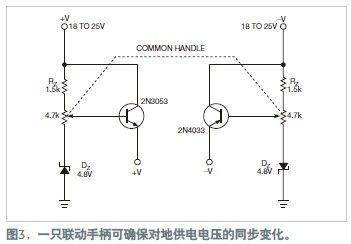 由于晶體管的基-集電極反偏擊穿電壓各不相同,因此電路提供了一種改變電源電壓的簡單方式(圖3)。隨著電壓的升高,與發(fā)射極連接的兩只LED都發(fā)光,而集電極只有一個LED發(fā)光(圖2中b和d)。±4V的基本電壓足夠用于檢測晶體管的基極或類型。如將電源電壓從±4V增至±15V,就可以測試很多種晶體管的發(fā)射極。考慮到串聯(lián)LED的壓降,這個范圍可為基射結(jié)提供最高26V以上的反向擊穿電壓。