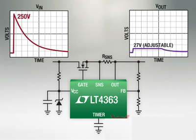 近日,凌力爾特公司推出過壓保護控制器 LT4363,該器件為高可用性電子系統提供了過壓和過流保護。當流過長電感性電源總線的電流突然變化時,就會發生電源電壓浪涌。另外,汽車電池還會經歷一種稱為負載突降的情況,在這種情況下,電壓會在持續多個 ms 的時間里處于上升狀態。傳統的保護電路依靠笨重的電感器、電容器、保險絲和瞬態電壓抑制器。而 LT4363 通過簡單地控制一個 N 溝道 MOSFET,實現了可靠、自適應和節省空間的設計。只有控制器和 MOSFET 經受高壓浪涌,下游組件可以提供較低電壓的額定值,因此節省了成本。