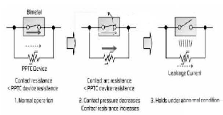 由于雙金屬觸點的低接觸阻抗,在正常操作下電流會流經雙金屬觸點。當出現諸如電動工具轉子鎖定這樣的異常事件時,電路中就會產生更高的電流,使雙金屬觸點打開,其接觸電阻也隨之升高。此時,電流就會分流到具備更低阻抗的PPTC器件上,同時也加熱雙金屬,使其打開并保持在鎖定的狀態, 從而有助于防止各觸點之間電弧的產生。請參考圖2。