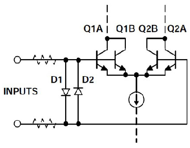 該電路適用于OP27等低噪聲運算放大器,也是許多其它采用低噪聲雙極性晶體管來構成差分對Q1-Q2的放大器的典型保護電路。如果沒有任何保護,可以看出,兩個輸入間高于大約7 V的電壓將導致Q2或Q1(取決于相對極性)反向結擊穿。注意,如果是射極-基極擊穿,則很小的反向電流也會導致兩個晶體管的增益和噪聲性能下降。發生射極-基極擊穿后,運算放大器參數(如偏置電流和噪聲等)可能會超出額定范圍。這通常是永久性的,逐漸而微妙地發生,特別是在由瞬變觸發的情況下。因此,幾乎所有低噪聲運算放大器,無論是基于NPN還是PNP,都會采用保護二極管,如輸入上的D1-D2等。如果施加的電壓超過±0.6 V,這些二極管就會導通,從而保護晶體管。