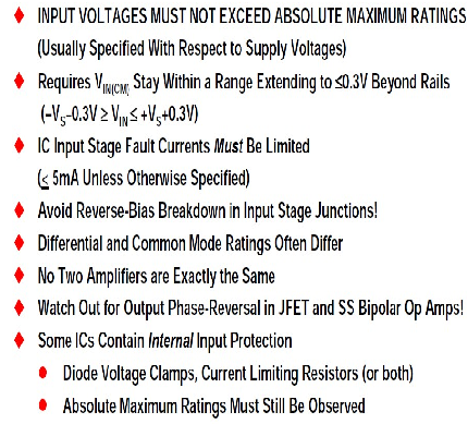 雖然可能存在一些例外,但務必注意:當發生超出電源軌0.3 V以上的過壓狀況時,多數IC運算放大器需要輸入保護。
