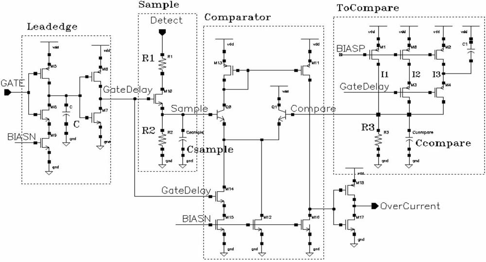 過流比較模塊主要由前沿消隱Leadedge、采樣電路Sample、比較電壓產(chǎn)生器ToCompare 和過流比較器Comparator 等組成,如圖3 所示。