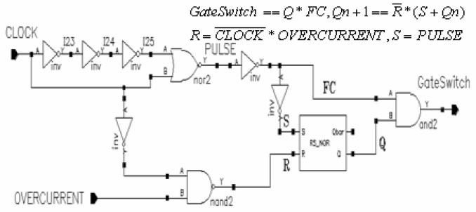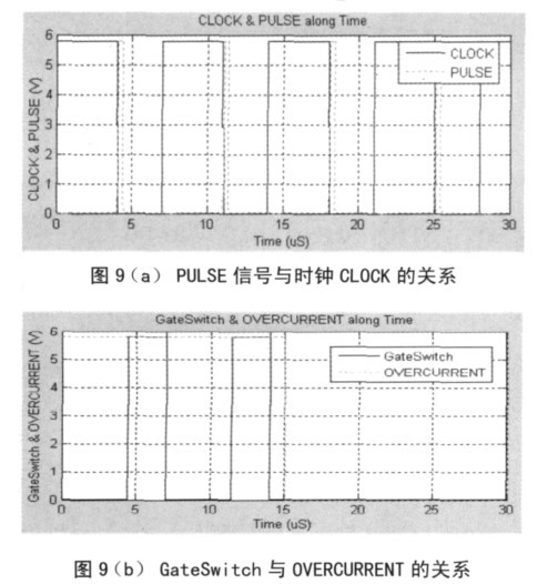 控制邏輯模塊如圖4 所示,該模塊直接控制LDMOS 的開關(guān)。PULSE 信號的上升沿對應(yīng)是CLOCK 時鐘的開始,PULSE 信號與時鐘CLOCK 的關(guān)系如圖9 所示。當(dāng)發(fā)生過流時,OVERCURRENT信號為低,觸發(fā)器R 端為高,Q 為低,GateSwitch 信號為低,關(guān)斷LDMOS,從而實現(xiàn)過流保護(hù)功能。