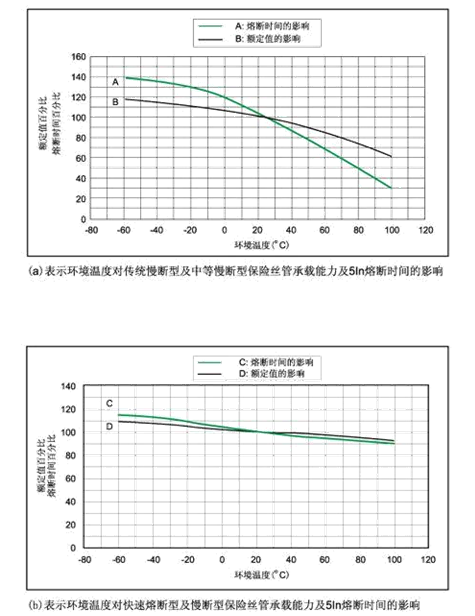 3、環境溫度對保險絲管承載能力的影響。詳見“環境溫度”