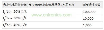 每次脈沖沖擊保險絲,保險絲都會受到一定的損傷,經過多次反復沖擊保險絲就會熔斷。以下為AEM產品耐受沖擊次數的表格: