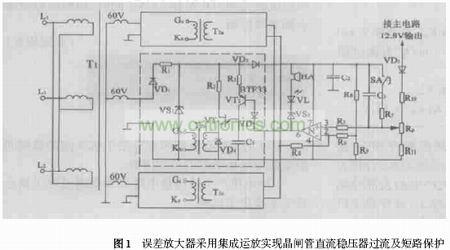 在擯棄電流采樣、放大和執(zhí)行等多個(gè)環(huán)節(jié)的情況下,將單結(jié)晶體管移相觸發(fā)器中的晶體管誤差放大器改為集成運(yùn)算放大器,就可實(shí)現(xiàn)晶閘管直流穩(wěn)壓器的過(guò)流及短路保護(hù),簡(jiǎn)化了電路結(jié)構(gòu),并提高了整機(jī)的穩(wěn)定可靠性能和AC - DC變換效率。