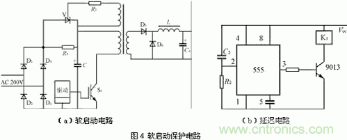 開關(guān)穩(wěn)壓電源的電路比較復(fù)雜,開關(guān)穩(wěn)壓器的輸入端一般接有小電感、大電容的輸入濾波器。在開機(jī)瞬間,濾波電容器會(huì)流過很大的浪涌電流,這個(gè)浪涌電流可以為正常輸入電流的數(shù)倍。這樣大的浪涌電流會(huì)使普通電源開關(guān)的觸點(diǎn)或繼電器的觸點(diǎn)熔化,并使輸入保險(xiǎn)絲熔斷。另外,浪涌電流也會(huì)損害電容器,使之壽命縮短,過早損壞。為此,開機(jī)時(shí)應(yīng)該接入一個(gè)限流電阻,通過這個(gè)限流電阻來對(duì)電容器充電。為了不使該限流電阻消耗過多的功率,以致影響開關(guān)穩(wěn)壓器的正常工作,而在開機(jī)暫態(tài)過程結(jié)束后,用一個(gè)繼電器自動(dòng)短接它,使直流電源直接對(duì)開關(guān)穩(wěn)壓器供電,這種電路稱之謂直流開關(guān)電源的 “ 軟啟動(dòng) ” 電路。如圖 4 ( a )所示在電源接通瞬間,輸入電壓經(jīng)整流橋( D1 ~ D4 )和限流電阻 R1 對(duì)電容器 C 充電,限制浪涌電流。當(dāng)電容器 C 充電到約 80 %額定電壓時(shí),逆變器正常工作.經(jīng)主變壓器輔助繞組產(chǎn)生晶閘管的觸發(fā)信號(hào),使晶閘管導(dǎo)通并短路限流電阻 R1,開關(guān)電源處于正常運(yùn)行狀態(tài).為了提高延遲時(shí)間的準(zhǔn)確性及防止繼電器動(dòng)作抖動(dòng)振蕩,延遲電路可采用圖 4 ( b )所示電路替代 RC 延遲電路.。