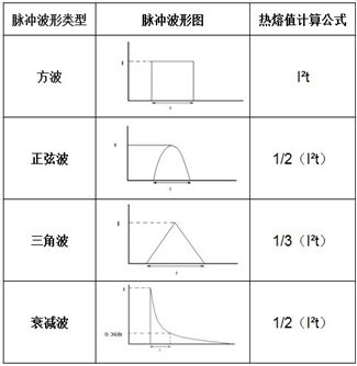 表2是幾種常見脈沖波形的計算公式。脈沖電流的熱熔值可以通過對脈沖電流波形數據的積分計算得到。
