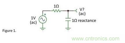 題目很簡單,如下所示:一個1V的交流信號,連接著一個1Ω電阻和一個1Ω電抗的電容。在電容兩端的交流電壓是多少?