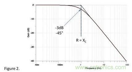R/C電路產生了極點。阻值和抗值相等時的頻率為“拐點”或稱截至頻率。這點的響應是-3dB(0.707V)的衰減,和45°的相位滯后。如圖所示:不需要數學計算,波特圖如下: