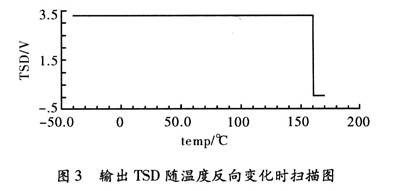 按照以上設計的電路。用Cadence Specture對其進行仿真,器件的模型參數采用0.35μm CMOS工藝。圖2為過溫保護電路的輸出控制信號TSD,隨溫度上升和下降的曲線。電源電壓取3.3 V。從仿真結果可以看出,該電路實現了良好的“溫度遲滯”特性。遲滯功能有效的避免了芯片出現熱振蕩問題。關斷溫度TH160°和恢復溫度TL140°。