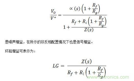 這對(duì)于理想的CFB[Ri=0]來(lái)說(shuō),是一個(gè)非常重要的公式,因?yàn)樗砻髁谁h(huán)路增益與反饋電阻的比例關(guān)系,因此反饋電阻可作為CFB的主要補(bǔ)償。事實(shí)上,增加反饋電阻及帶寬(BW),不僅會(huì)降低反饋電阻,同時(shí)還可增大帶寬。實(shí)際上,不可能將反饋電阻降低到特定值以下,否則放大器會(huì)發(fā)生振蕩。