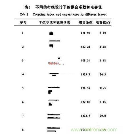(1)印制板布局時,要將模擬電路區和數字電路區合理地分開,電源和地線單獨引出,電源供給處匯集到一點;PCB布線時,高頻數字信號線要用短線,主要信號線最好集中在PCB板中心,同時電源線盡可能遠離高頻數字信號線或用地線隔開。其次,可以根據耦合系數來布線,盡量減少干擾耦合。(見表1)