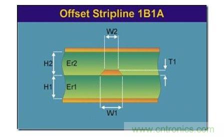 帶狀線是置于兩個參考平面之間的帶狀導線,如下圖所示,H1和H2代表的電介質的介電常數可以不同。