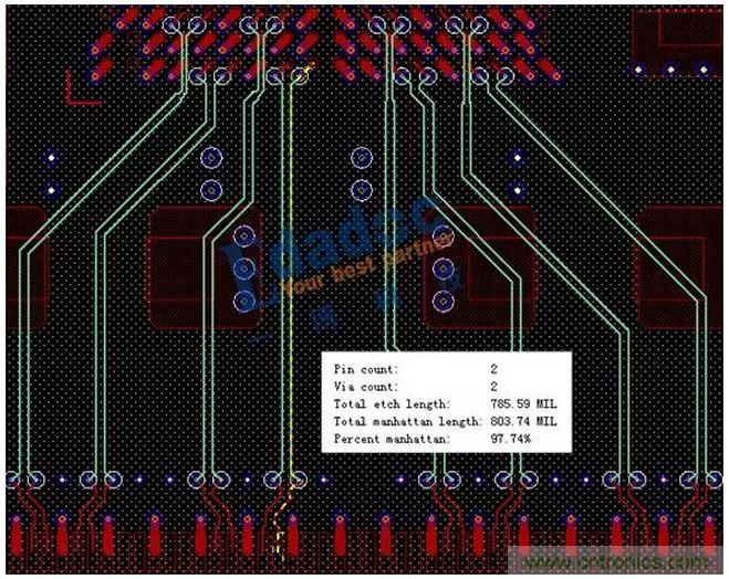 連接器采用的是CFP2的表貼連接器,由于PHY芯片到光口連接器距離很短,所以當(dāng)初設(shè)計(jì)的時(shí)候就直接從芯片打孔連線過(guò)來(lái),沒(méi)有經(jīng)過(guò)任何特殊的處理,最后板上走線總長(zhǎng)度約800mil,如下圖一所示。