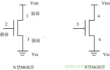 以N型管為例,2端為控制端,稱(chēng)為“柵極”;3端通常接地,稱(chēng)為“源極”;源極電壓記作Vss,1端接正電壓,稱(chēng)為“漏極”,漏極電壓記作VDD。要使1端與3端導(dǎo)通,柵極2上要加高電平。