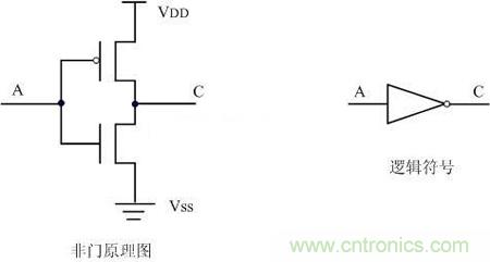 A端為高電平時(shí),P型管截止,N型管導(dǎo)通,輸出端C的電平與Vss保持一致,輸出低電平;A端為低電平時(shí),P型管導(dǎo)通,N型管截止,輸出端C的電平與VDD一致,輸出高電平。
