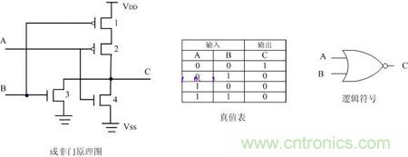 將上述“與非”門(mén)、“或非”門(mén)邏輯符號(hào)的輸出端的小圓圈去掉,就成了“與”門(mén)、“或”門(mén)的邏輯符號(hào)。而實(shí)現(xiàn)“與”、“或”功能的電路圖則必須在輸出端加上一個(gè)反向器,即加上一對(duì)CMOS管,因此,“與”門(mén)實(shí)際上比“與非”門(mén)復(fù)雜,延遲時(shí)間也長(zhǎng)些,這一點(diǎn)在電路設(shè)計(jì)中要注意。
