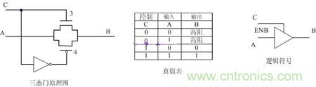 當(dāng)控制端C為“0”時(shí),3、4管都截止,輸入端A的電平狀況無(wú)法到達(dá)輸出端B,輸出端B呈現(xiàn)高電阻的狀態(tài),稱(chēng)為“高阻態(tài)”。