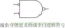 上述圖中畫(huà)的邏輯器件符號(hào)均是正邏輯下的輸入、輸出關(guān)系,即對(duì)“1”(高電平)有效而言。而單片機(jī)中的多數(shù)控制信號(hào)是按照負(fù)有效(低電平有效)定義的。例如片選信號(hào)CS(Chip Select),指該信號(hào)為“0”時(shí)具有字符標(biāo)明的意義,即該信號(hào)為“0”表示該芯片被選中。因此,“或非”門(mén)的邏輯符號(hào)也可以畫(huà)成下圖。