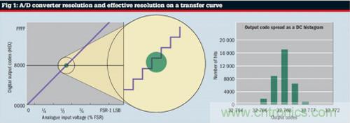 A/D轉(zhuǎn)換器的分辨率被定義為輸入信號(hào)值的最小變化,可通過一次計(jì)數(shù)改變數(shù)字輸出值。就理想的A/D轉(zhuǎn)換器而言,傳遞函數(shù)呈階梯狀,且每個(gè)步階寬度等于分辨率。但使用較高分辨率(16位或16位以上)的系統(tǒng)時(shí),傳遞函數(shù)的響應(yīng)和理想的響應(yīng)之間將存在較大的偏差。這是因?yàn)橛葾/D轉(zhuǎn)換器及驅(qū)動(dòng)器電路產(chǎn)生的噪聲可降低該轉(zhuǎn)換器的分辨率。