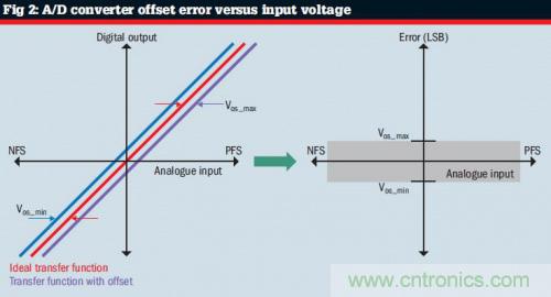 偏移誤差(VOS)。該誤差是A/D轉(zhuǎn)換器實(shí)際傳遞曲線和理想傳遞曲線之間的恒定差異(見圖2)。它是測(cè)定的數(shù)字輸出,通過把A/D轉(zhuǎn)換器輸入端短接到接地(GND)獲得。