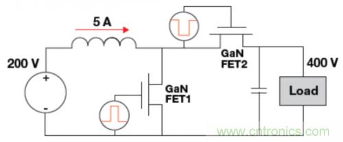 當(dāng)GaN FET關(guān)閉時(shí),電感器電流通過一個(gè)二極管再次流至輸入端,這就免除了對(duì)負(fù)載電阻器的需要,并且能夠達(dá)到節(jié)能的目的。這個(gè)單元與處于連續(xù)電流模式下的電感器一同運(yùn)行。由于目標(biāo)是開關(guān)變換,通過使用短占空比,可以達(dá)到節(jié)能的目的。這個(gè)元件能夠改變施加的電壓、電流、頻率,以及器件所處環(huán)境的溫度。額外的漏電流(圖4)由二極管電容提供。