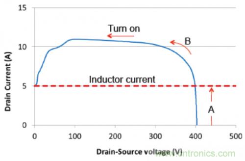 器件應(yīng)力由使用圖2中所示拓?fù)涞纳龎恨D(zhuǎn)換器顯示。圖3中顯示的是初級(jí)側(cè)開關(guān) (FET1) 上硬開關(guān)接通變換的仿真結(jié)果。輸入電壓為200V,而電感器電流為5A(負(fù)載電流大約為2.5A)。在這個(gè)情況下,當(dāng)FET1關(guān)閉時(shí),由于鉗制FET (FET2) 導(dǎo)電,它的漏電壓大約鉗制在400V。因此,當(dāng)FET1接通時(shí),它需要在Vds開始下降之前灌入整個(gè)電感器電流(區(qū)域A)。