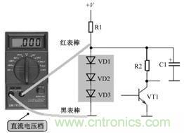 檢測這一電路中的3只二極管最為有效的方法是測量二極管上的直流電壓,如圖所示是測量時接線示意圖。如果測量直流電壓結果是1.8V左右,說明3只二極管工作正常;如果測量直流電壓結果是0V,要測量直流工作電壓+V是否正常和電阻R1是否開路,與3只二極管無關,因為3只二極管同時擊穿的可能性較小;如果測量直流電壓結果大于1.8V,檢查3只二極管中有一只開路故障。