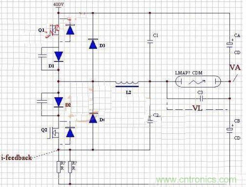 再講時序,當換相,如:Q1停,輪到Q2工作的瞬間,當Q2開,此時L2上的壓降是200V(VA)+VL,慢慢過渡到200V(VA)-VL。這個瞬間給C2放電的電流并不經過電流采樣電阻,隨電功率大,C2容量也大,小功率時可以靠Q2硬撐,大功率時,幾十安的沖擊電流如何能撐?在這種拓撲里,為了兼顧電流采樣的有效性C3遠遠小于C1C2。