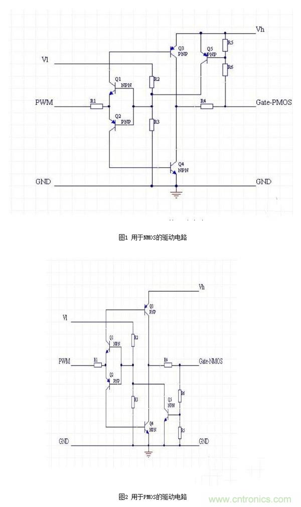 這里我只針對NMOS驅動電路做一個簡單分析:Vl和Vh分別是低端和高端的電源,兩個電壓可以是相同的,但是Vl不應該超過Vh。Q1和Q2組成了一個反置的圖騰柱,用來實現隔離,同時確保兩只驅動管Q3和Q4不會同時導通。 R2和R3提供了PWM電壓基準,通過改變這個基準,可以讓電路工作在PWM信號波形比較陡直的位置。 Q3和Q4用來提供驅動電流,由于導通的時候,Q3和Q4相對Vh和GND最低都只有一個Vce的壓降,這個壓降通 常只有0.3V左右,大大低于0.7V的Vce。 R5和R6是反饋電阻,用于對gate電壓進行采樣,采樣后的電壓通過Q5對Q1和Q2的基極產生一個強烈的負反饋, 從而把gate電壓限制在一個有限的數值。這個數值可以通過R5和R6來調節。